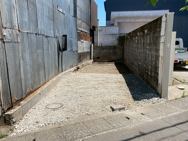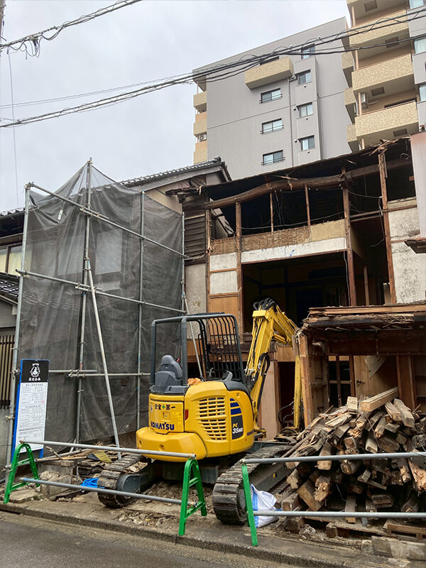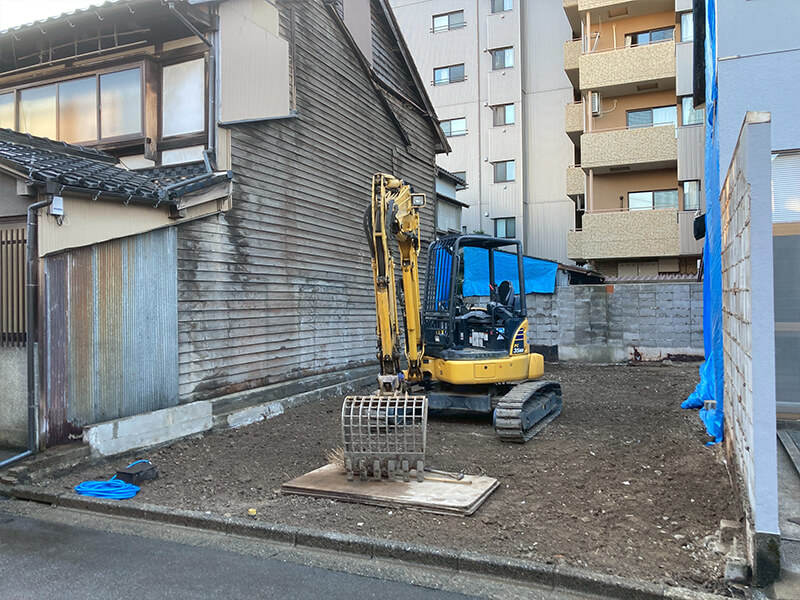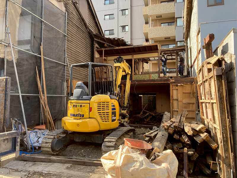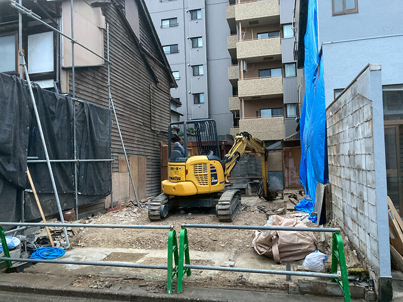 隣接建物保護のため周囲には厳重な養生を施した上で、建物は細心の注意を払った手作業解体、土間コンクリートは小型重機を使用しての施工となりました。