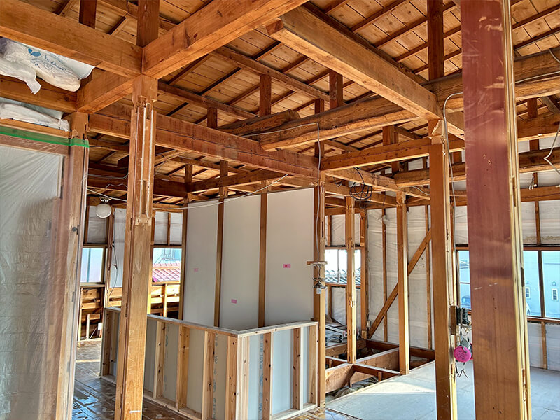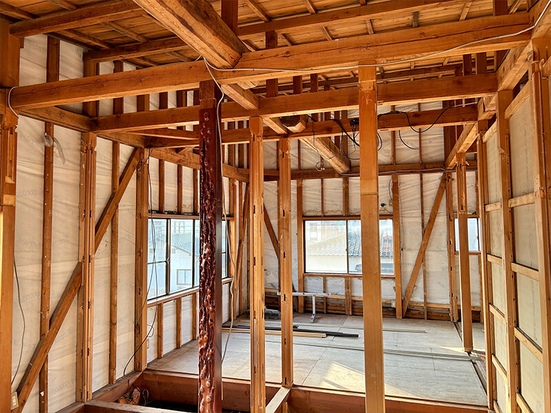 リノベーションにともなう、内部解体のご相談です。屋根・柱はすべて残したスケルトン状態(新築の上棟時の様な状態)・特に床柱はキレイに残してほしい・階段もそのまま残してほしい、とのことでした。